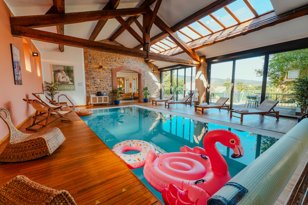Nestled in the heart of the Pyrénées-Orientales, Le Paradis Perdu is a 300 m² luxury chalet for 9 guests, featuring a heated indoor pool and panoramic views over the mountain peaks. Wood stove, table football, arcade machine, pétanque, 40 m² terrace... everything is here for an unforgettable holiday with family or friends. The natural thermal baths of Saint-Thomas? Just a 20-minute walk away.