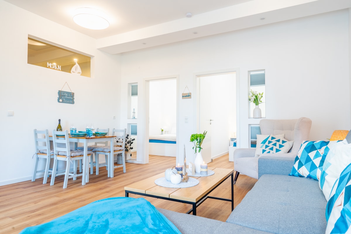 該公寓位於田園詩般的Vieregge村莊中一棟精心現代化的房屋內 - 對於所有想遠離遊客人潮、享受寧靜與大自然的人來說,這是一個真正的秘密。這間 34 平方公尺的公寓透過大窗戶和天窗,光線充足,並以高雅、簡潔的家具和私人露臺令人信服。設施包括一間獨立臥室、一間現代化浴室以及一個寬敞的客廳和餐廳區域,配有開放式小廚房。