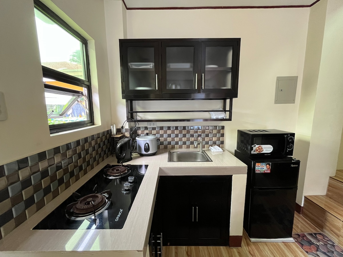 Highlights / Quick Glance • Loft-style duplex 1 queen sized bed and 1 double sized bed • Pet-friendly (₱500 fee; pets must wear diapers at all times) • Full kitchen: gas stove, microwave, oven toaster, fridge, utensils • TV with Netflix + Internet/Wi-Fi • Parking inside or outside the compound • Water: 1 free gallon included, additional ₱30 per gallon • Guests bring their own towels, toothbrush, toothpaste, shampoo & soap ⸻