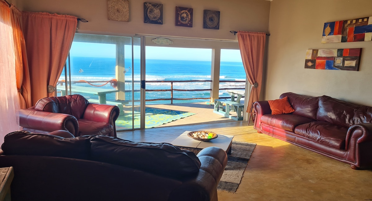 This 10-sleeper holiday home features three double rooms, a twin room, and an open-plan loft with two single beds and three sleeper couches. Fully furnished with two bathrooms, it offers stunning ocean and garden views, braai facilities, and a pool.