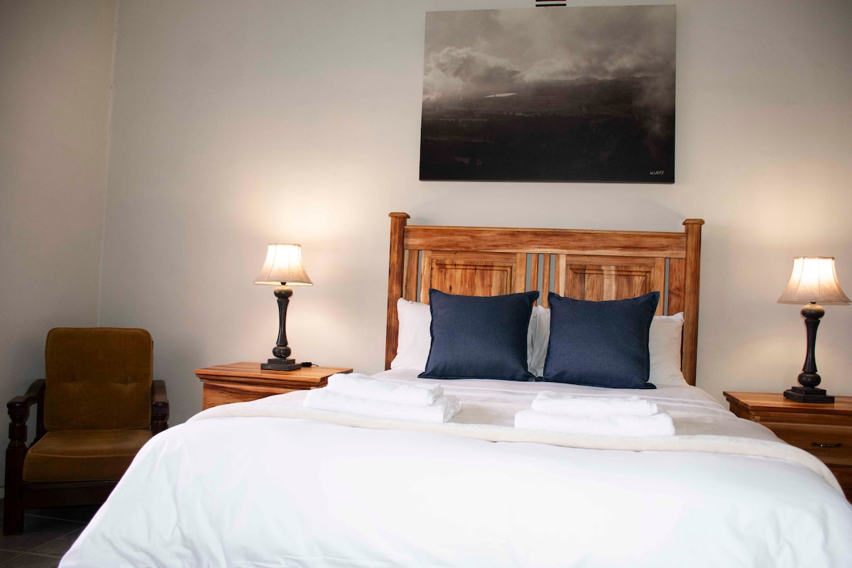 Soak in panoramic views of the Outeniqua Mountains from this light-filled, open-plan studio. Surrounded by indigenous trees. The upstairs studio features large windows, a fully equipped kitchen, queen-sized bed, and en-suite bathroom. Natural light fills the space, creating an inviting atmosphere. Downstairs, with its own private entrance, is a spacious second bedroom with a queen-sized bed, en-suite bathroom, and a small table and chairs.