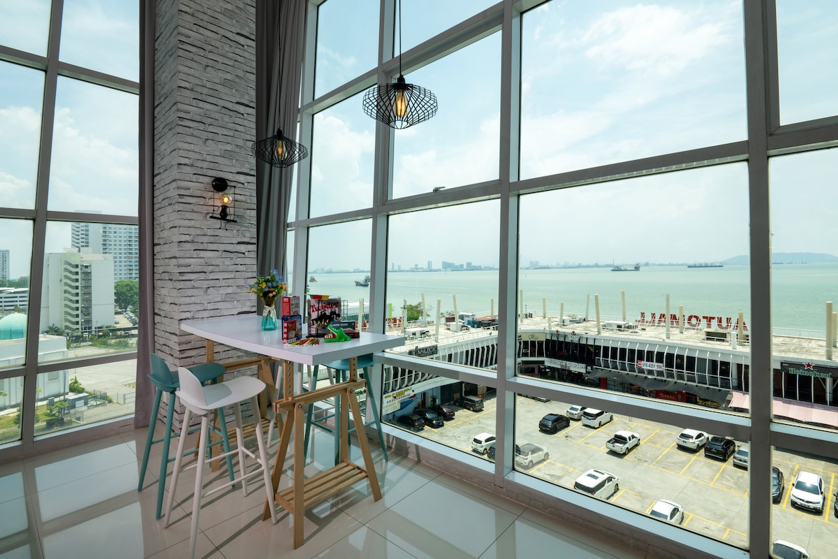 Maritime Suites by Comfy Penang ★ Coastline Seaview ★ at Waterfront Seaside ★ Duplex with high floor to ceiling glass window ★ High floor ★ Landmark Komtar View ★ 5 stars Superhost Comfy Homestay Team ★ 5 to 10 minutes drive to UNESCO Heritage Core Zone ★ 24 hours 7-Eleven & Starbucks below our house • 1000 square feet • 1 car park • 300 Mbps WiFi • 30 restaurants, cafes, pubs, Starbucks, Coffee Bean, Subway, 7-Eleven are below our house • Fully air-conditioned