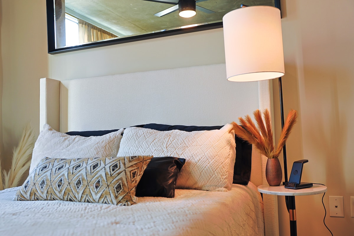 在備受歡迎的Altitude Building體驗市中心的奢華。 這間時尚公寓距離梅賽德斯-賓士體育場、州農場體育館和百年公園僅幾步之遙,完美融合酒店風格的設施和家居舒適度。 享受城市景觀、特大床、度假村式泳池,絕對無需退房。 非常適合商務旅客、情侶和活動參與者。
