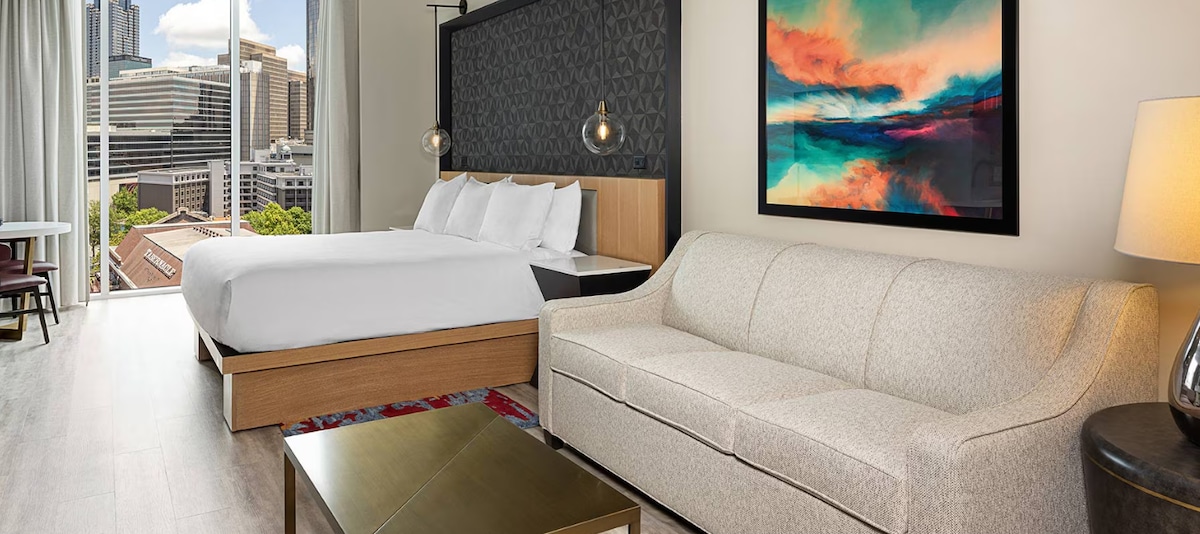You must be 21 years of age or older to check in. Experience vibrant city life blended with warm Southern hospitality in the heart of downtown Atlanta. Overlooking Centennial Olympic Park, this resort puts you steps from the SkyView Ferris wheel, notable museums, and the famous Georgia Aquarium. Unwind on-site with a signature restaurant featuring three themed bars, or soak in skyline views from the rooftop pool and bar after a day of exploring.