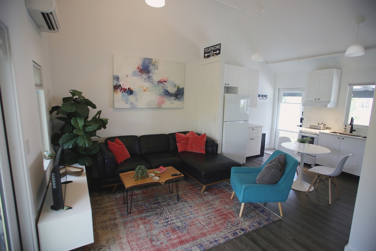 Sunny-ALL PRIVATE Garden Suite! ONE Queen bed--prime bedding, a loveseat, full bathroom with shower (no tub), a kitchenette w. 2 electric burners, small refrigerator, microwave, toaster, blender, waffle maker, and coffeemaker. Highspeed Wi-Fi. Just redecorated with noise control wall, premium bedding, google home, and Netflix already installed! Note: Only one parking space assigned.