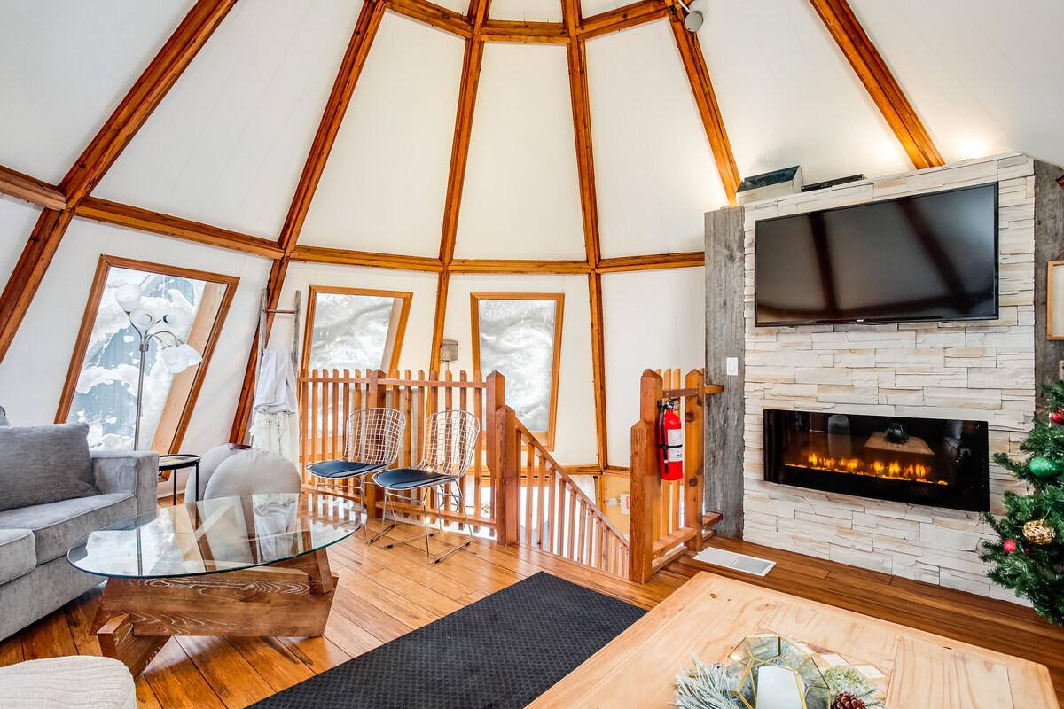 The Beehive is a Blue Mountain landmark. This dome-shaped chalet is adorable & Instaworthy! Compact and cozy inside, the chalet has 6 bedrooms + a sofa bed accommodating groups of up to 14 guests. The circular living room in the loft is a unique space to gather and connect. Conveniently located at the top of the North Chair & just minutes away from Scenic Caves & Blue Mountain Village.
