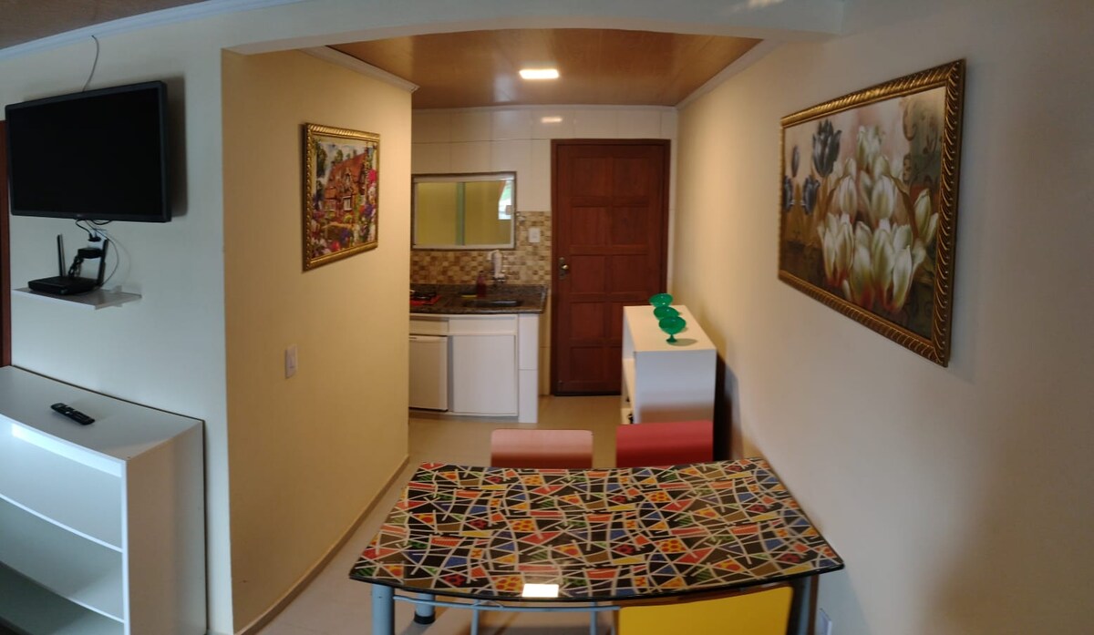 全新設備齊全的舒適公寓,舒適的床,配有空調、Wi-Fi和Sky有線電視,全功能廚房,配有淨水器,位於非常安靜的街區,靠近Geribá和Ferradurinha海灘,房子拐角處有一家很好的麵包店。