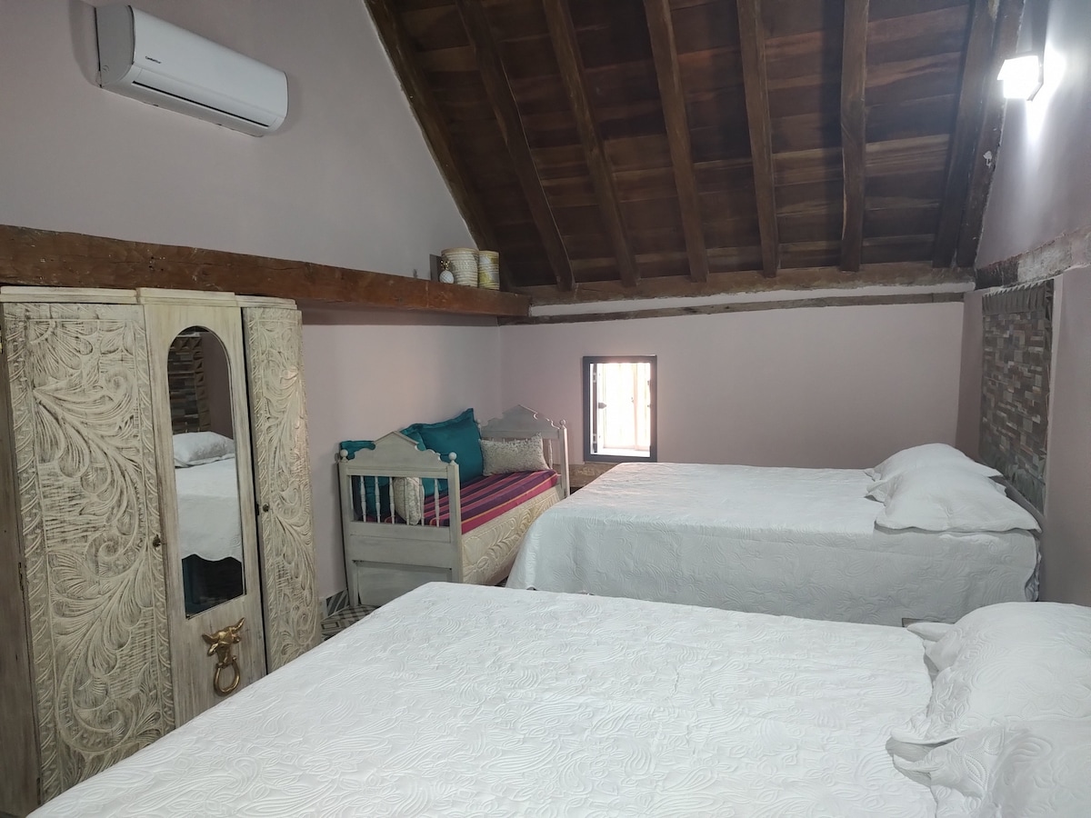 El alojamiento esta ubicado en el histórico y bello vecindario de Getsemani, el cual esta lleno de colores y mucha historia que debes recorrer. tiene calles mágicas y con mucho arte, pero lo mas valioso es su gente diversa. Por el sector se puede caminar con toda seguridad, nuestra casa tiene dos pisos, en el piso superior está la habitación y que cuenta con 3 camas, aire acondicionado un baño y un pequeño balcón, en el primer piso tenemos sala, cocina equipada un baño y un patio con lavadora.
