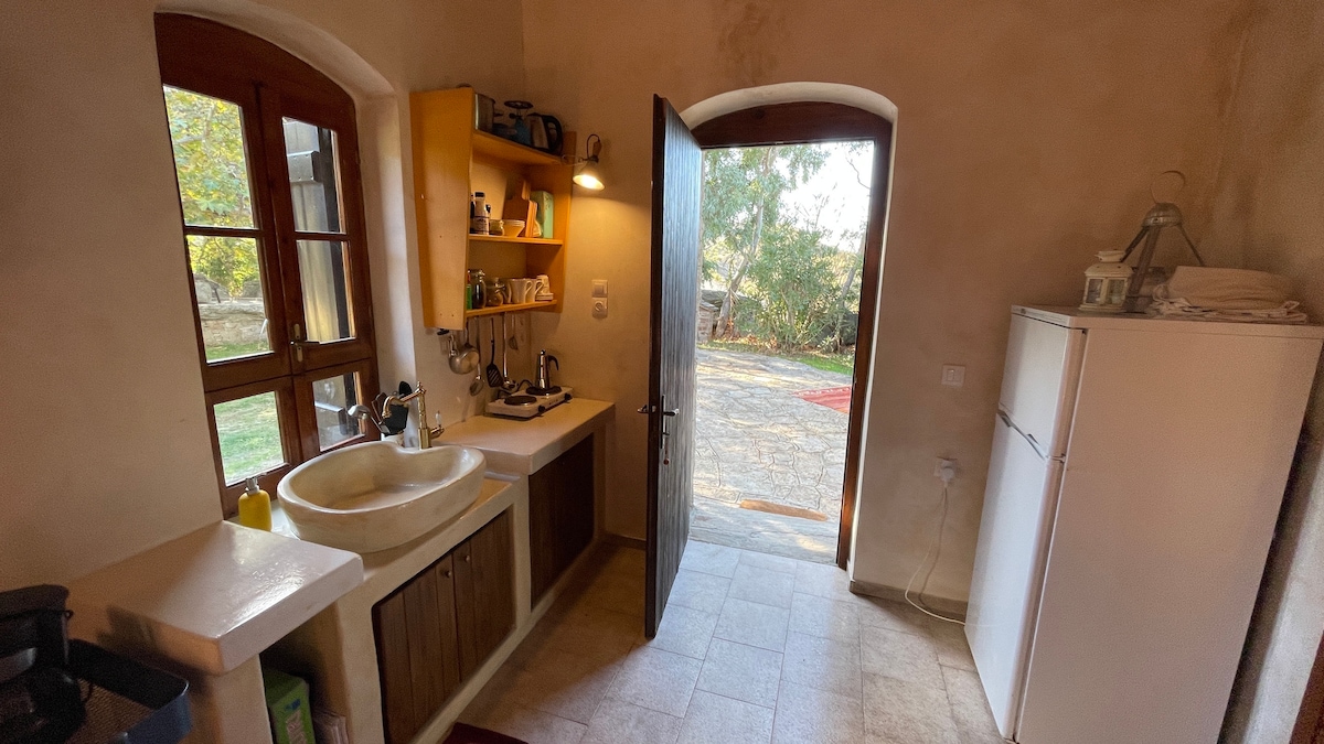 Das traditionelle Steinhaus grenzt an einer Seite an die natürliche Felswand. Das Bad ist ganz in den Fels hinein gebaut. Das ergibt ein ganz spektakuläres Wohngefühl und den Eindruck, mitten in der Natur zu sein. Die Terrasse hat eine wunderschöne Aussicht auf das Meer, den Strand von Fytema und die Berge von Messaria. Die Wohnung ist 2023 mit ökologischen Materialien im traditionellen Stil ausgebaut worden. Zum Strand sind es nur 200 m.