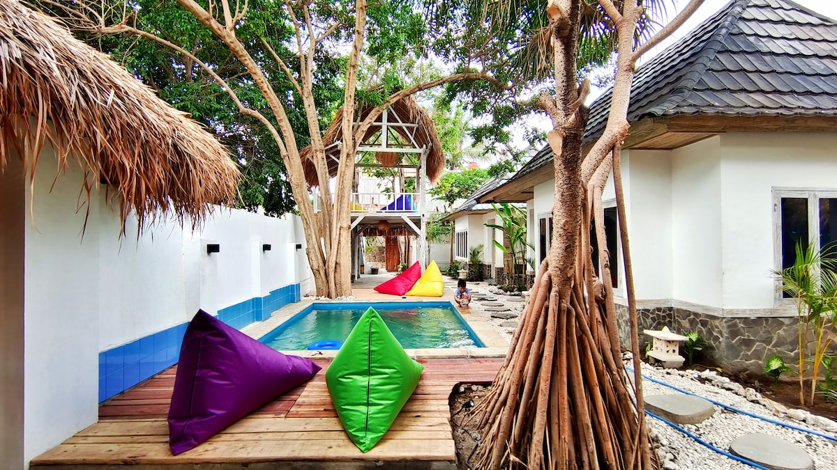 欢迎来到PandaHome。我们在吉利岛Tarwngan,住宿距离港口和繁华的街道约300米,入住非常方便。民宿附近有一大片蔚蓝的海洋和白色的沙滩,从房子步行只需5分钟就可以看到蔚蓝。同时,晚上您可以步行到酒吧街享受派对的喧闹。我们民宿的房型有:双床家庭房和大床房。房屋之间有游泳池和阳光阁楼,客人可以在游泳池游泳,也可以在阳光阁楼喝咖啡,享受安静的时光。客人来自四面八方,我们民宿的每一扇窗户都是一颗敞开的心,它正在等待着您的到来。