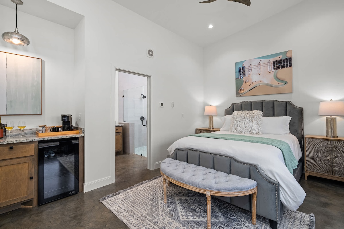 Welcome to No. 3, a modern private upstairs suite in a fully renovated 1900’s home in Fredericksburg, Tx. - Studio-style layout with a King-sized bed and gas fireplace - Relaxing atmosphere with a private courtyard and hot tub - Kitchenette with mini-fridge, microwave, and coffee-maker - Open concept bathroom with a soaker tub and double vanity - Complimentary Wifi access - Check in at 4 PM, Check out at 11 AM (early check in available for a fee on request) - No pets, no smoking in unit