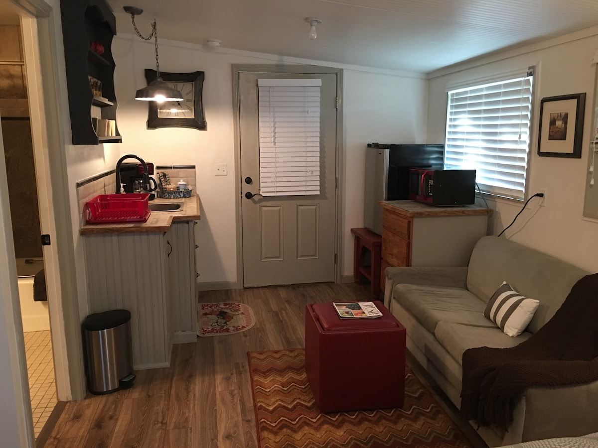 步行半英里即可抵達主街!Bluebonnet Hideaway Suite非常舒適僻靜。 套房是新翻修的寬敞臥室,配有拱形天花板、質樸的天花板樑和充足的自然光線。 更新的浴室包括大型玻璃淋浴間和步入式衣櫃。設備齊全的咖啡吧配有迷你冰箱、Keurig咖啡機和微波爐。 外面是一個私人露台,配有按摩浴池。現場停車。套房完全私密,有自己的獨立入口。