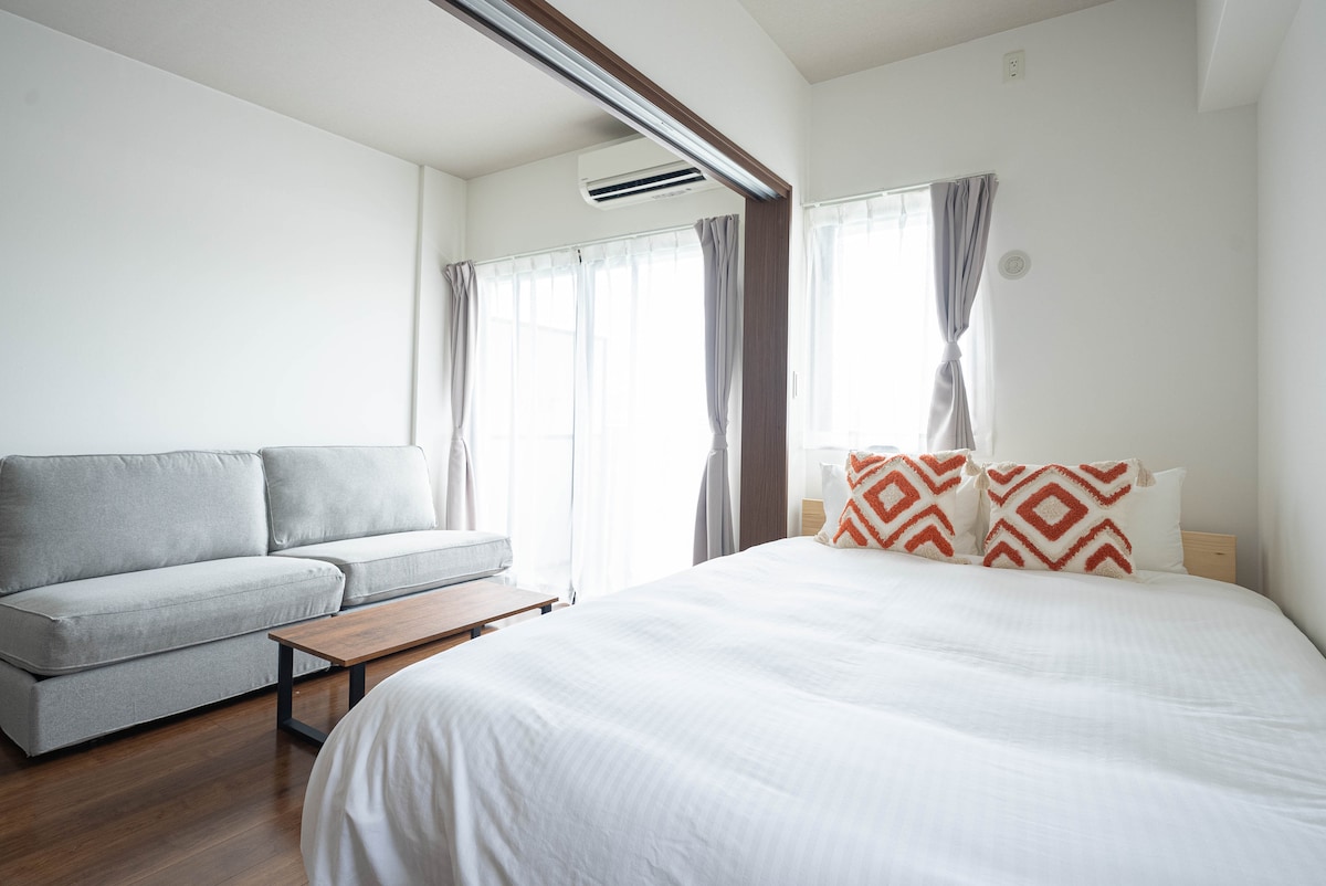 距離福岡「天神地鐵站」步行5分鐘。改建公寓的一個房間。1 張雙人床和 1 張沙發床。