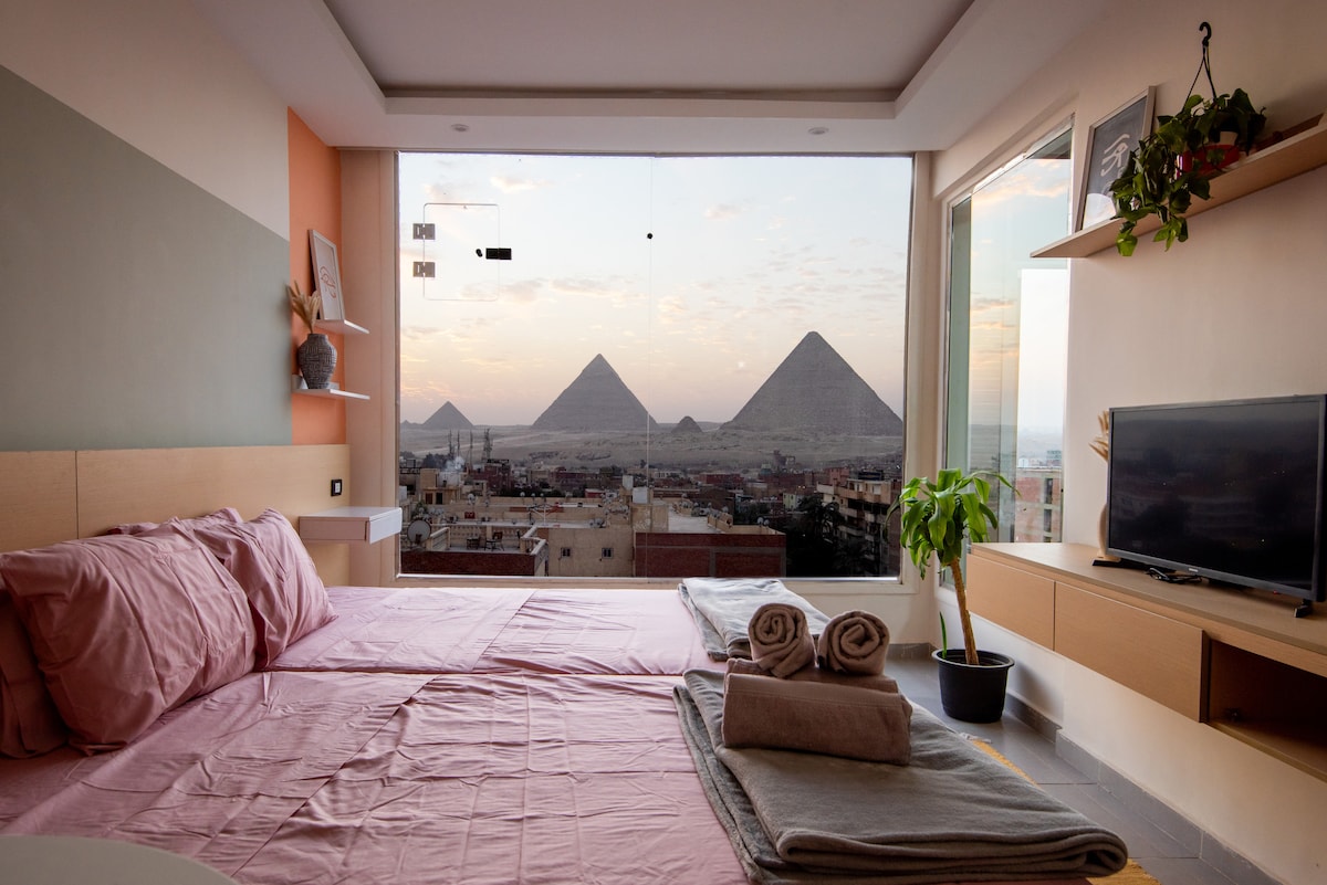 歡迎來到無與倫比的生活體驗!這間豪華公寓可欣賞古代世界七大奇蹟之一的胡夫大金字塔(Great Pyramid of Khufu)的壯麗景色。這間住宅地理位置優越,結合現代優雅與歷史宏偉。 我們的公寓由在飯店業工作多年的業主維護,他了解什麼是愉快的住宿。