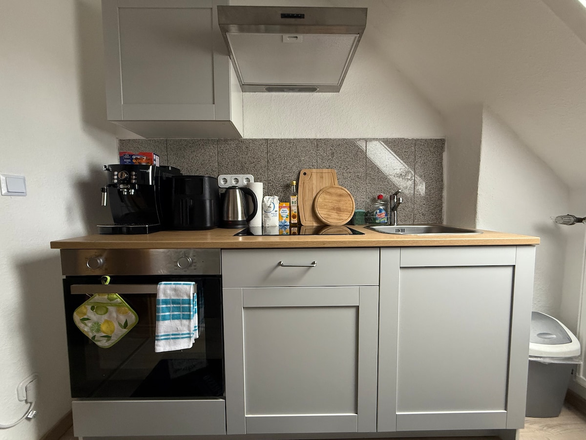 我們出租一個獨立的、約 60 平方公尺的閣樓公寓/房屋,它有自己的入口,位於我們擁有 100 多年歷史的房屋的附屬建築中,適合想要「不同」住宿的客人! 公寓是獨立的,與主屋分開。公寓有自己的露台或花園。 房子周圍有森林和田野,您可以在羅馬利佩路線上散步或騎自行車。魯爾區(杜伊斯堡、埃森)就在附近。 附近有超市、披薩店和藥局。