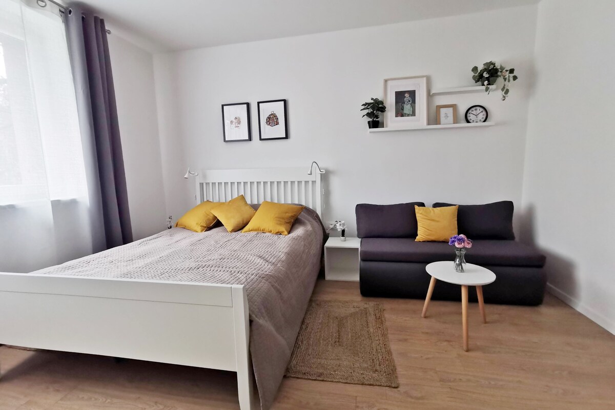 市中心全新優雅公寓,步行不到10分鐘即可抵達主廣場和火車站。位於主街道上安靜的後院,讓您享受安靜的夜晚。有一間配有標準雙人床的臥室、配有電視+ NETFLIX和拉出式沙發(標準雙人床)的客廳、配有馬桶的浴室和寬敞的步入式淋浴間。所有家具和電器都是全新的。免費茶和咖啡、免費毛巾。