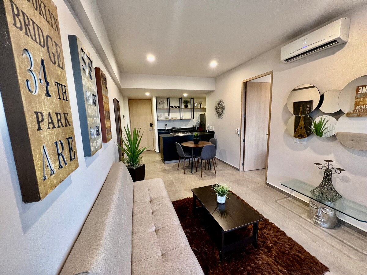 現代化的新公寓,可欣賞瓜達拉哈拉的壯麗城市景觀。 位於安全的塔樓,提供24小時保安和私人停車位。 距離Expo Guadalajara僅5分鐘,距離La Minerva 8分鐘,距離Chapultepec和美國領事館10分鐘。 非常適合商務旅行或休閒住宿:家庭、團體和專業人士。 享用2間睡房、2.5間浴室、明亮的客廳、設備齊全的廚房和快速WiFi ,適合工作或放鬆。