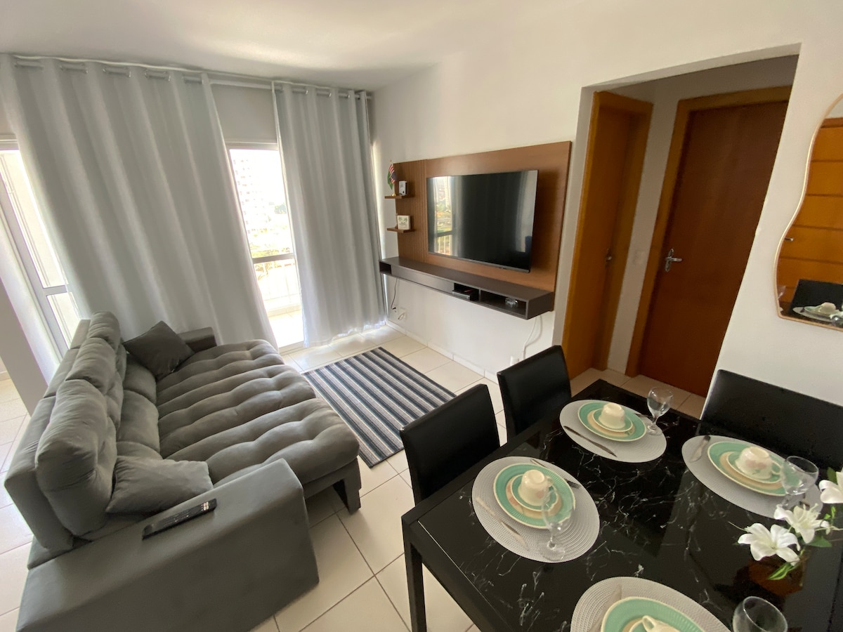 Apartamento de alto padrão, 26º andar, excelente localização, totalmente equipado. Dois quartos (ambos suíte), está a 300m do Parque Flamboyant, a poucos metros do Pão de Açúcar e do Jardim Goiás Mall. O apartamento conta com Wi-fi e TV com canais. Primeiro quarto cama king size e ar condicionado. O segundo quarto duas camas de solteiro. Varanda com área de jantar e bela vista. A cozinha totalmente equipada com utensílios novos. O condomínio oferece serviços como academia, piscina e garagem.