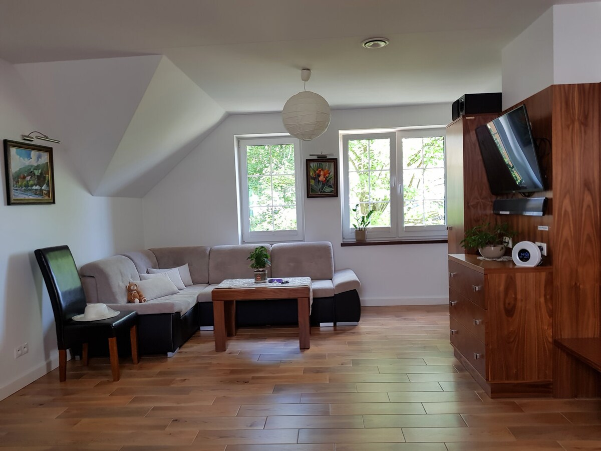 適合 2 至 4 人入住的氛圍公寓,位於克里尼察 (Krynica) 中心,距離步行街 3 分鐘,距離購物中心 3 分鐘。公寓的優點是可俯瞰帕克山的大陽臺和舒適的裝潢。公寓位於一棟十九世紀的歷史木建築中。Wi-Fi、電視、設備齊全的廚房、窗戶下的城市停車位。 可以將自行車或其他設備存放在單獨的儲物空間。