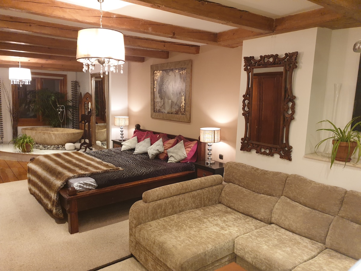 我們迷人的套房配有休息/睡眠區域,可舒適容納2-4人。位於我們的農舍,距離市中心10分鐘車程。 享受鄉村和市中心。包含早餐(在花園天氣好的時候)。極佳的免費WiFi。 包括毛巾(每日乾淨)和牀單/毯子。套房內有咖啡機、熱水器、冰箱。水邊的漂亮花園可供放鬆,有彈跳牀和小足球場。