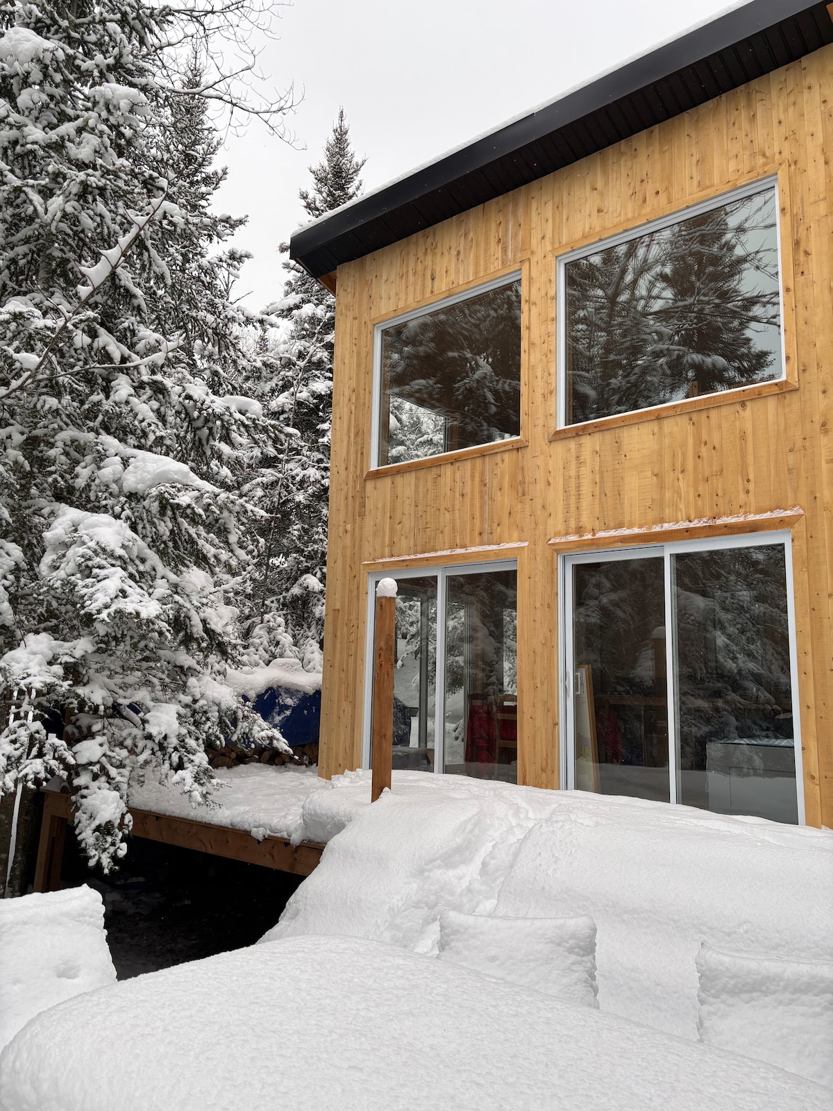 Small Scandinavian chalet for two people ideally located to enjoy the attractions of Charlevoix. It has a thermal circuit (hot tub, sauna, hammam) Very intimate and in the middle of the woods, the view overlooks the majestic river and the mountains in the distance. All the modern equipment is there and the comfort is absolute A/C and outdoor fireplace. The open concept design was designed for an immersive experience in nature: large windows, panoramic shower. Access via a private road at 500 m.