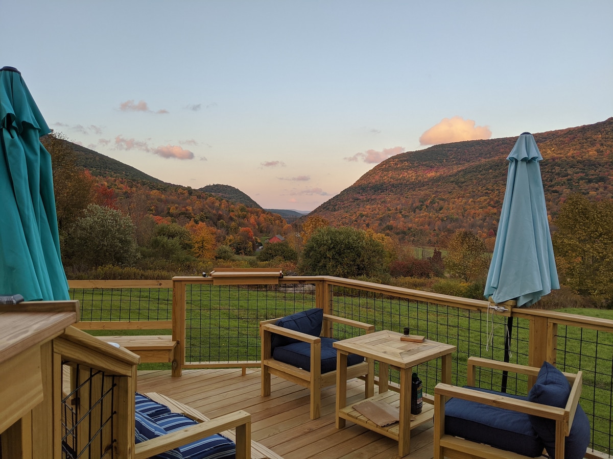 NOTE: Click “Show More” to read the full description. Home with stunning views perfectly situated between Roxbury and Stamford! Drink your morning coffee at the bar on the deck overlooking the mountains, curl up with a good book in the reading nook, or explore the farms, mountains, and countryside of the beautiful Western Catskills. Cabin is situated on five beautiful acres at the end of a private drive. Beautiful sunrises over the mountains, with wide-open stargazing after dark.