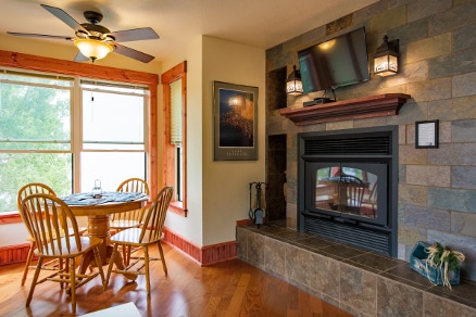 Nestled along 540ft of rocky beach, Inn Suite #8 offers bird’s eye views and sounds of Superior. This spacious attic suite features a stunning window seat, wood fireplace, plush futon, wingback chair and ottoman, and private entry. Just off the dining area is a well-equipped full-size kitchen. The bedroom has a queen bed, gas stove, and balcony. The luxurious bathroom boasts a claw foot tub. Inn Suite #8 sleeps up to 5 people (2 on the futon, 1 child on window seat).