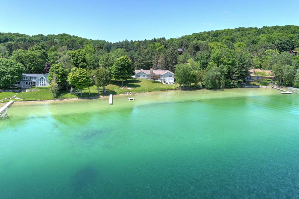 Explore the charm of this magnificent six-bedroom residence, located on the banks of Lake Leelanau in Leland, Michigan. This home features an open floor plan, highlighting sweeping views of the lake from numerous living spaces. An iIdeal space for family gatherings and social events, the layout is designed for engagement and enjoyment. Boasting 360 feet of waterfront, the property provides endless possibilities for boating and swimming.