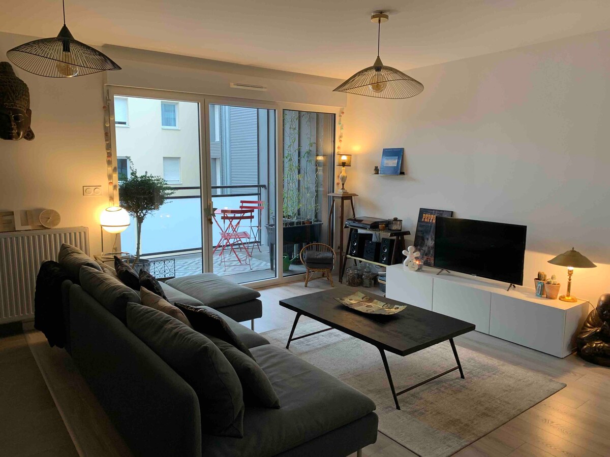 舒適、溫馨的 46 平方公尺公寓,配有朝南的露臺,一樓有樹木(32 平方公尺),位於新建且安靜的住宅區。冬季供暖良好。 免費停車 步行 5 分鐘即可抵達火車站,靠近商店,步行 15 分鐘即可抵達歷史悠久的城市和海灘 可應要求提供床單:每張床每次住宿收費10歐元 免費提供毛巾 與浴室分開的第二間廁所 免費WiFi 附近有許多餐廳提供外帶服務。 可遠距工作