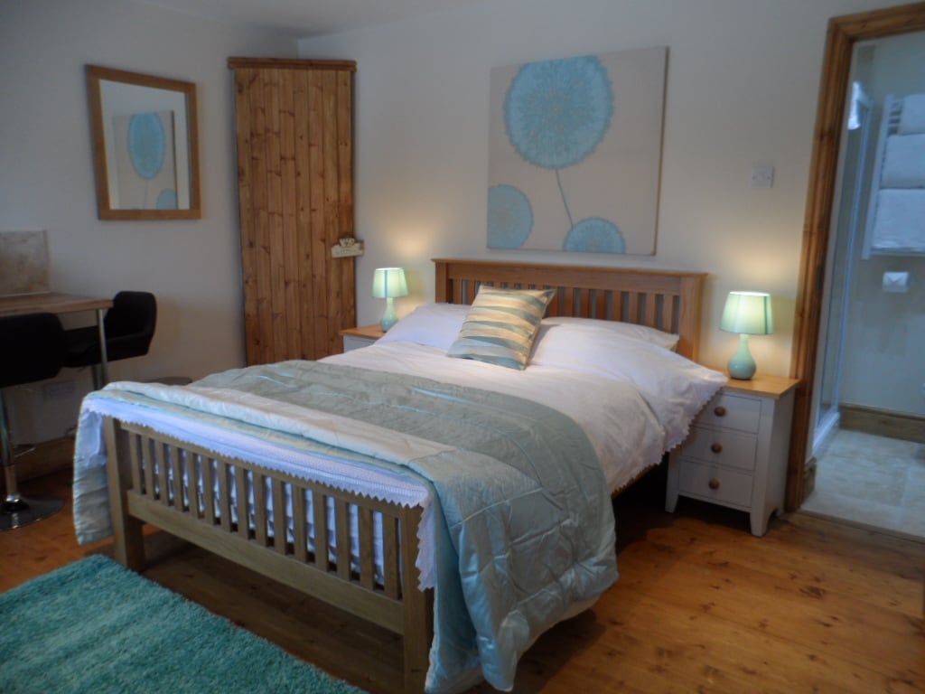 You will be staying on the edge of the village with views of fields, woods and hills. Only a few minutes riverside walk to village centre where there is a variety of places to eat , shops, pubs, Brewery! homemade Gelato! Your room is a comfortable double ensuite room with its own access . There is tea and coffee making facilities in the room, access to a utility room with sink, toaster, fridge , toilet and washing machine. There is outdoor seating, private parking and room for bicycles.