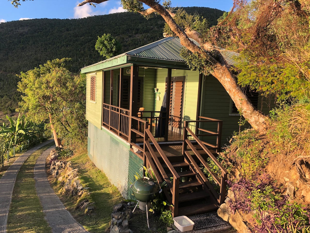可愛的小屋,180度白水景觀。您可以看到並聽到下面的海浪聲。空調、私人、浪漫,配有華麗的戶外淋浴間。 湯匙進入親密的巢穴。沉浸在島嶼的微風中。欣賞日出和月出,看著它們在颶風洞(Hurricane Hole)的水面上閃閃發光。透過太陽能和純淨的雨水、豐富的建議、忠告和內行建議,融入島嶼生活的節奏。 歡迎來到簡單優雅的世界。