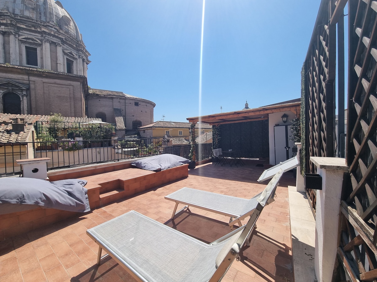 In Piazza del Paradiso, you’ll find a charming and renovated apartment with direct access to a large private terrace with panoramic views. The apartment features a double bed, a fully equipped kitchen with oven and dishwasher, a bathroom with shower, and a sofa bed. A truly magical place, thanks to the furnished terrace that immerses you in the beauty of Rome. The impressive dome of the Church of Sant’Andrea della Valle and the surrounding rooftops create a unique and unforgettable experience.
