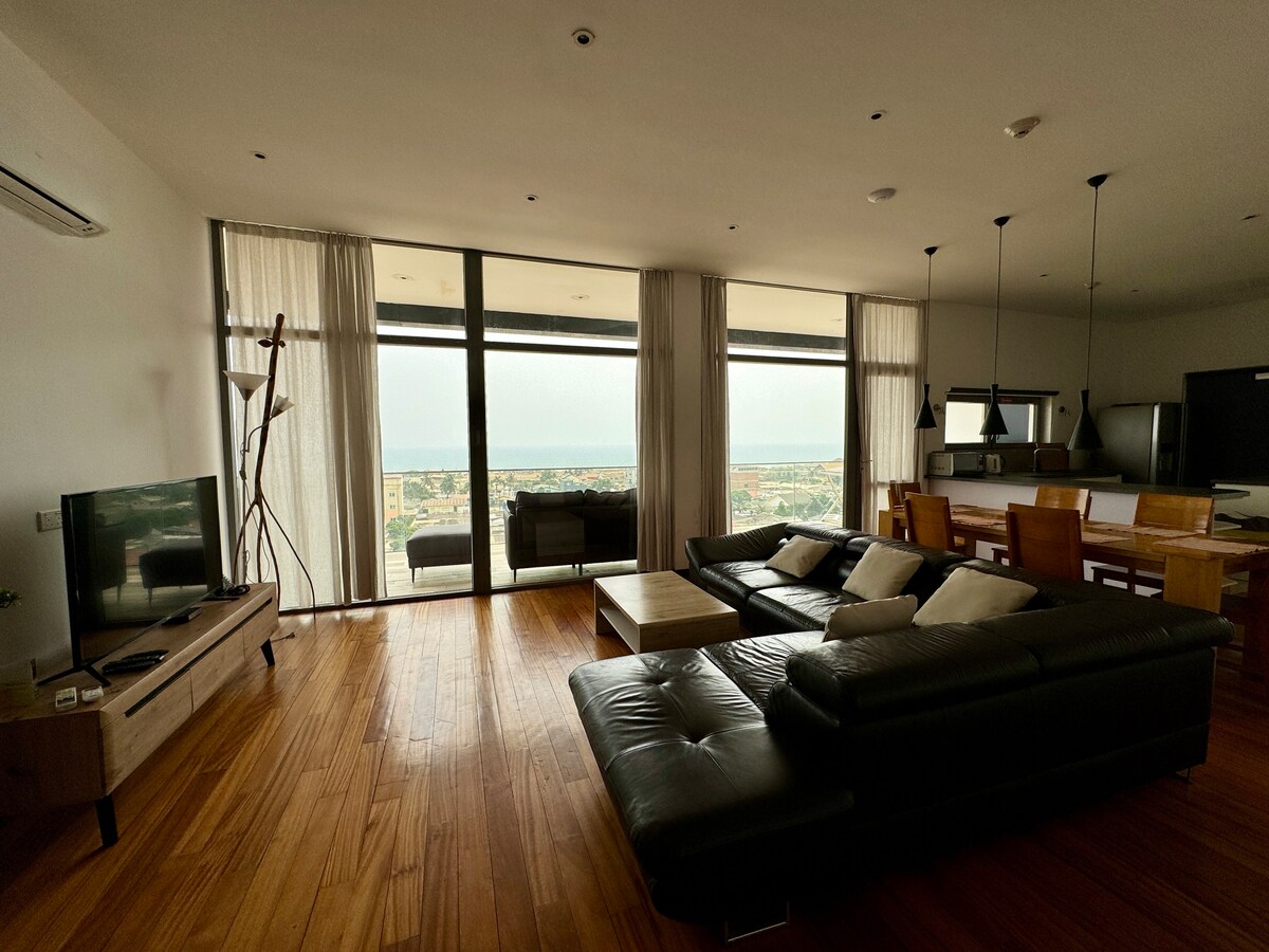 在這間豪華的3房頂層公寓,醒來時即可欣賞阿克拉最美的海景。 你可以乘坐私人電梯直達公寓,步行至環繞公寓的陽台,或走到屋頂的無邊際泳池、酒吧和餐廳。 這個空間非常適合團體、家庭和商務旅行,配有酒店式床鋪、設備齊全的廚房、快速Wi-Fi +專用工作空間、單位內洗衣機/乾衣機架和24小時保安,所有這些都位於靠近Osu、海灘和夜生活的中心位置。