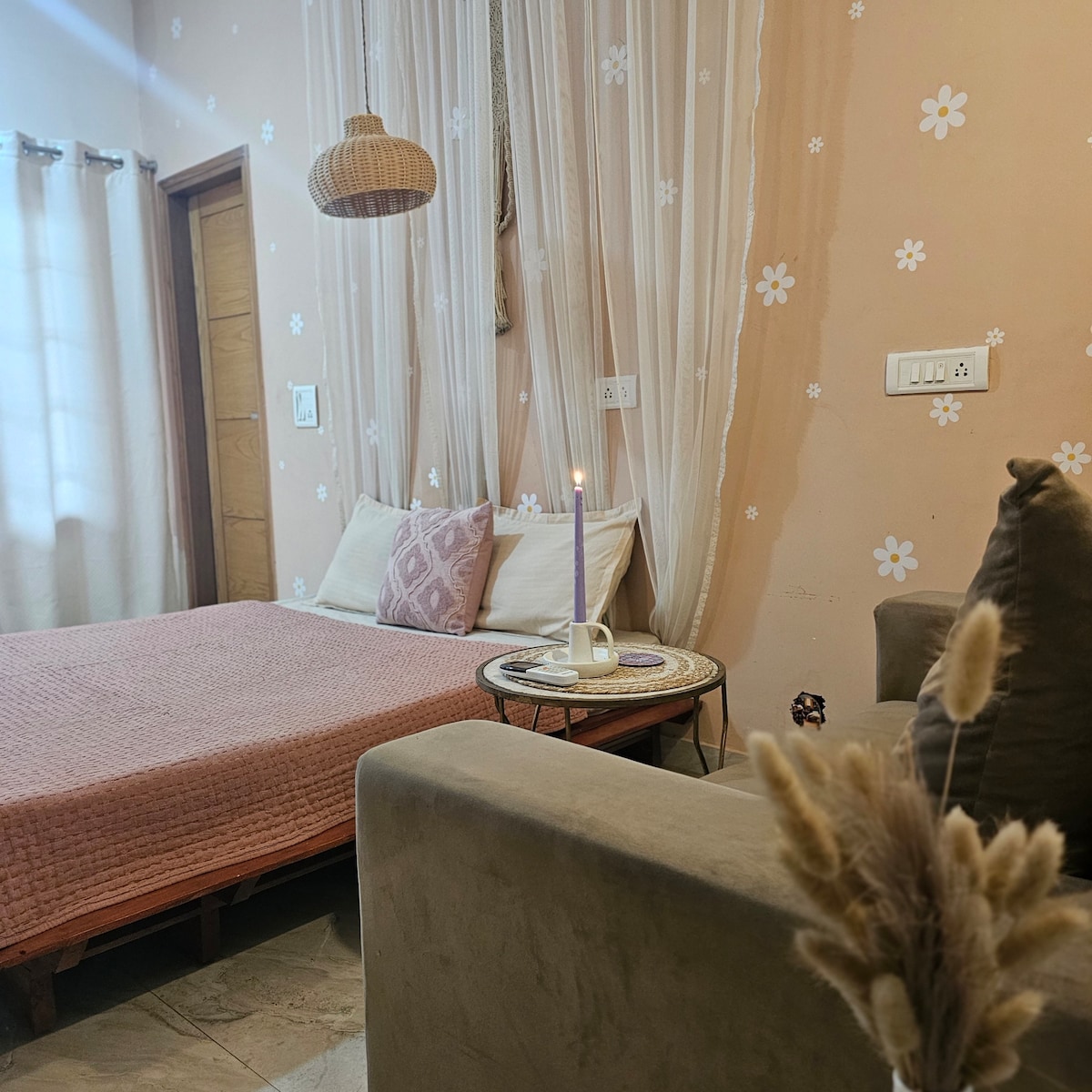 歡迎來到我們的環保天堂,配有按摩浴缸 在古爾岡的私人1BHK中體驗舒適,配有按摩浴缸、私人洗手間、廚房和陽台/露台,配有2人座鞦韆和綠色露台,讓您的心情更好。 禁止訪客入住。 我們是專業的房東,隨時為您提供協助。 我們位於2樓的獨立1BHK(注意:沒有電梯)提供舒適的度假勝地!