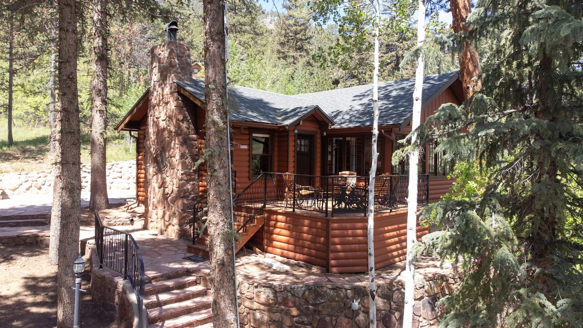 Among giant boulders, waterfalls, aspens and pines is Lucy's Lodge, where Rocky Mountain rustic meets modern luxury in secluded escape. Dramatic views, wrap-around decks, luxury details, outdoor dining, fully appointed kitchen, crisp white linens, bedroom fireplaces, and a hot tub under a blanket of stars. This cabin truly delights the soul. Walk to town or mountain trails, picnic by a lake or waterfall, or relax, play games, sing karaoke, or read a book as wildlife passes by.