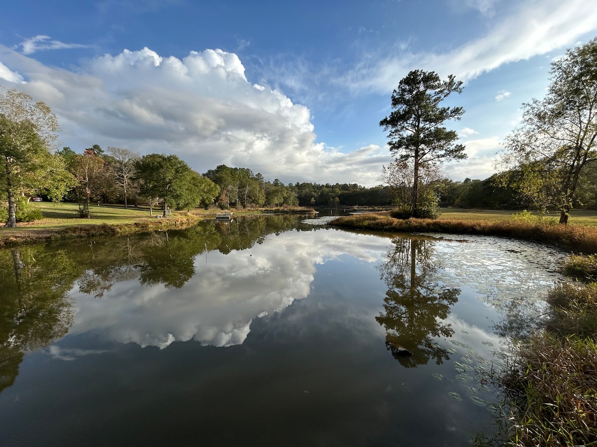 在魔幻般的森林中與全家人一起放鬆身心! 您的一天開始品嚐咖啡,俯瞰美麗的1英畝池塘,四周環繞著60英尺的鬆樹。 如果您想度過一個充滿冒險的下午,想像一下在前甲板上釣魚,並乘坐獨木舟探索池塘,如海龜、鴨子和其他野生動物。 體驗美麗的日落,為什麼要在露臺上燒烤。 在巨大的鬆樹和帶噴泉的池塘之間,這裡是完美的婚禮場地!