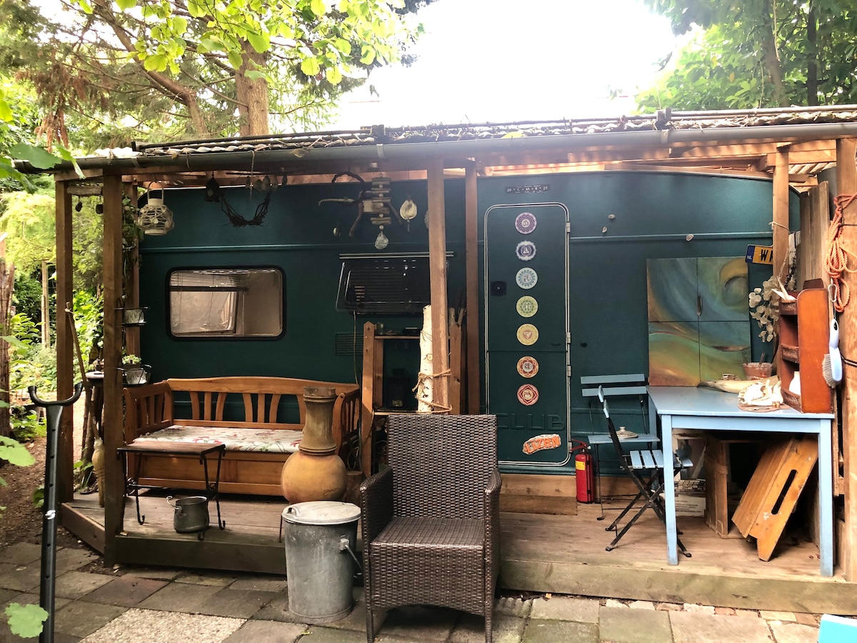 Hippie-life! Super gezellige Caravan, Veranda en Privé Terras, omringd door Bomen, Kippen en Poezen. Gaskachel, Warm Water. Koude Buitendouche. Toilet buiten, maar wel overdekt.