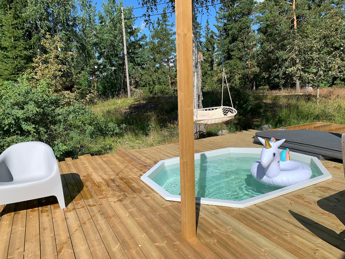 安靜的位置,坐落在靠近大海的田園詩般的環境中,在門外開車約15分鐘即可抵達Norrtälje。 在草坪上方,您就在海邊、私人碼頭和桑拿房旁邊。 關於房源: 帶露臺的清新小木屋,配有戶外傢俱和燒烤設施 臥室配有一張120張牀,客廳有一張沙發牀。 小廚房配有兩個燃燒器、冰箱、冷凍櫃、水槽和家居用品。 禁止攜帶寵物