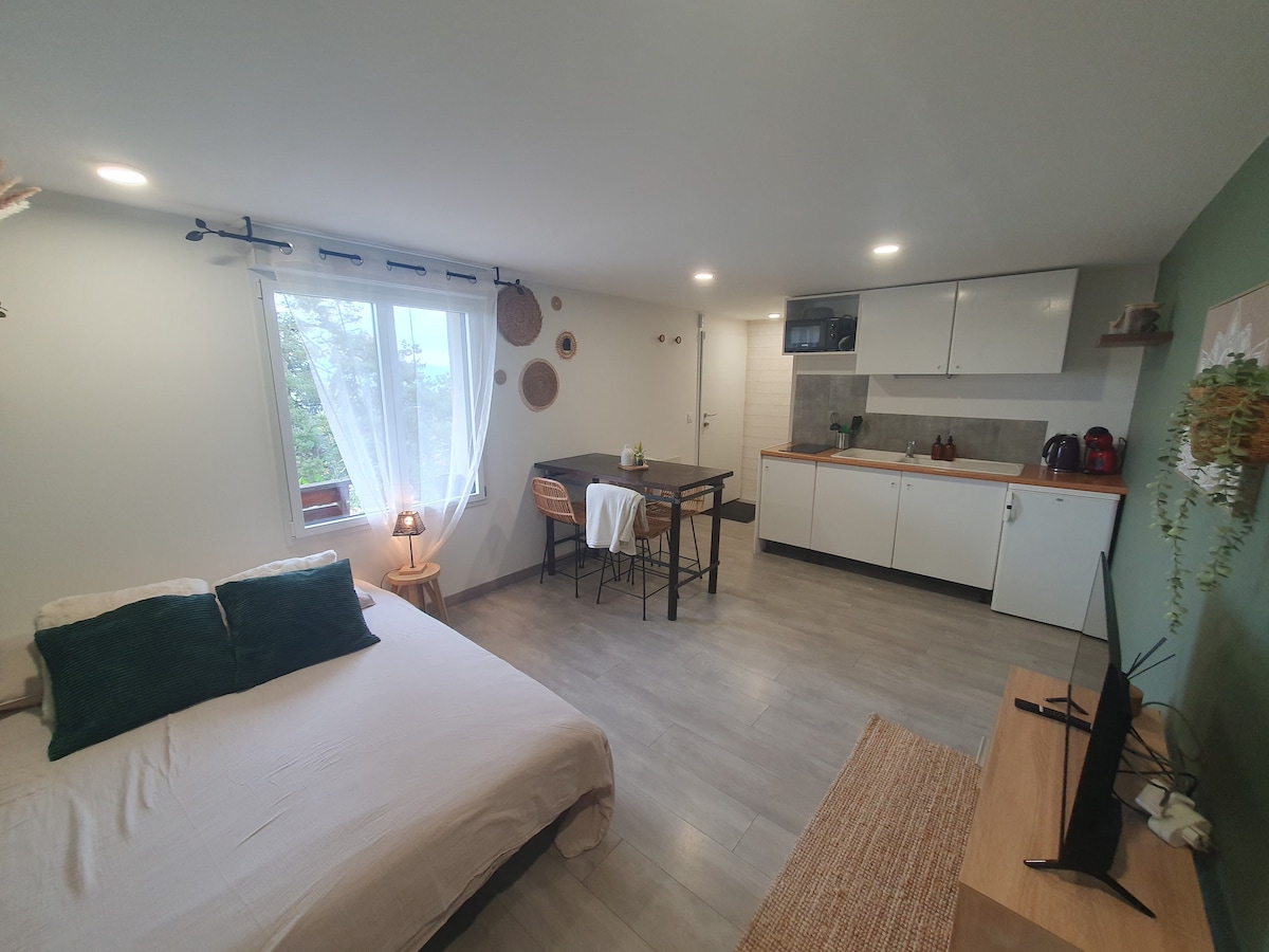 位於業主房屋花園底層的 32 平方公尺大型單間公寓。 獨立入口,田園環境(房子面向田野)保證安靜,可以欣賞到森諾茲山(Semnoz)的美景(著名的滑翔傘運動地點,由於著陸區在 300 公尺外,可以看到滑翔傘從房子上方飛過)。 這套設備齊全的單間公寓,配有整合式廚房和帶淋浴間的浴室,於 2016 年全面翻新。 非常適合 2 2 至 3 人入住(1 對夫婦帶 1 名孩子)