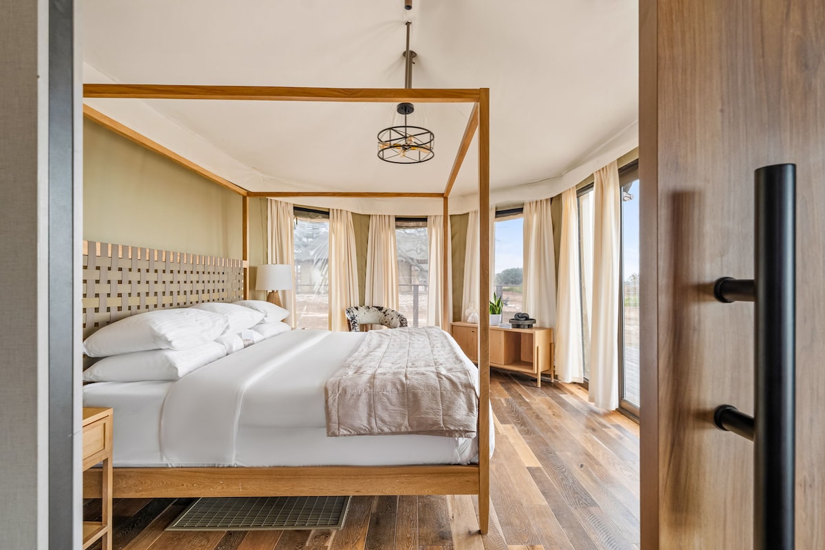 我們的高架帳篷套房非常適合尋找機會脫離繁忙並欣賞德州景觀的情侶。 我們的帳篷擁有400平方英尺的起居空間,建在1,000平方英尺的環繞式私人甲板上、一張加大雙人牀、迷你分離式空調和暖氣、配有淋浴間和浸泡式浴缸的套房浴室,以及一個配有兩張皮革椅的小起居區域。