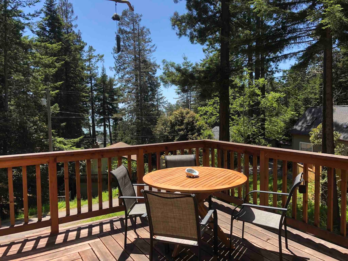 Private, cozy, modern cottage with towering redwoods, blue water views, and a hot tub, located in Anchor Bay, walking distance to the Anchor Bay beach and town! Listen to seals barking and the ocean waves as you soak in the hot tub or relax on the deck surrounded by redwoods. The house is modern & comfortable w/ 2 bedrooms, a full bath with a soaking tub, fully appointed kitchen, vaulted ceilings & open floor plan. Great WIFI, tons of CHARM, and even a small fenced area for your furry friends!