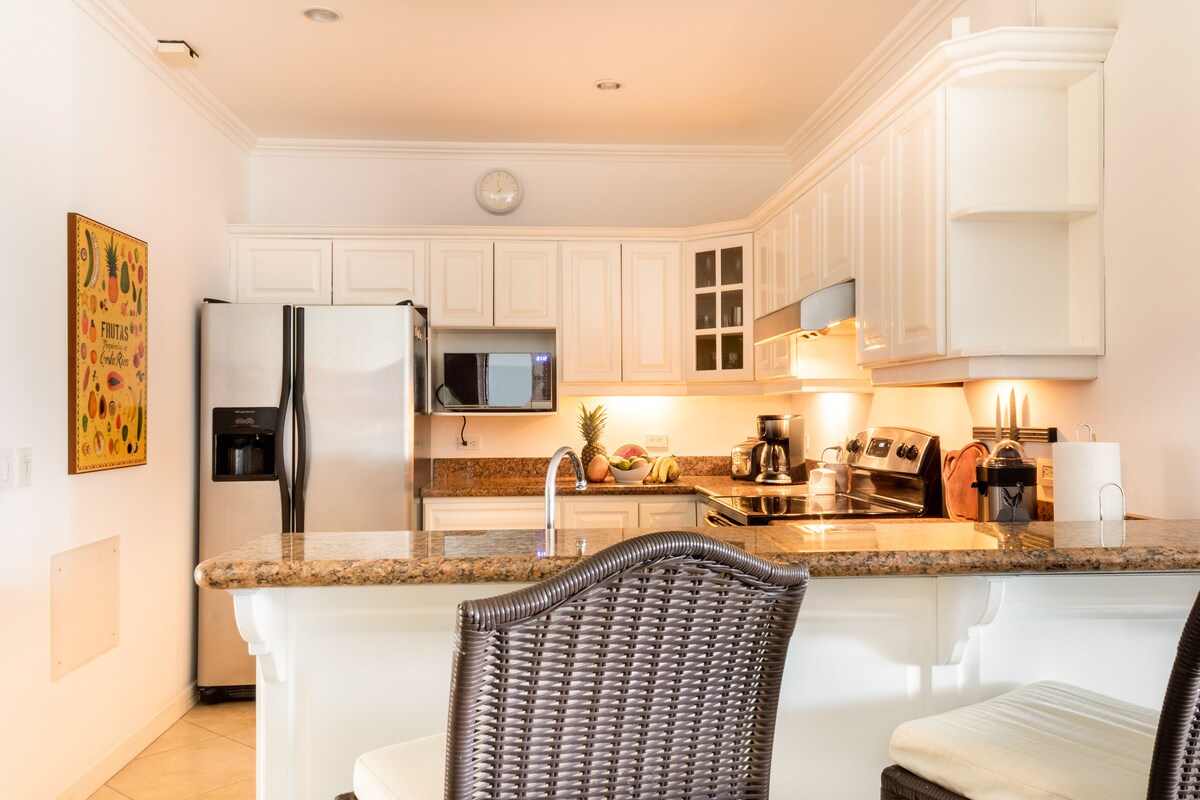 Green Villas步行10分鐘即可抵達城鎮,步行15分鐘即可抵達塔馬林多(Tamarindo)或蘭戈斯塔(Langosta)海灘。 此公寓位於二樓,有1間臥室、客廳有沙發床和空調、1間浴室、設備齊全的廚房、毛巾、WiFi和停車位。 這是一個私密安靜的區域,有8套複合公寓,共用美麗的大型公共泳池、涼亭和燒烤區域 此外,靠近超市、藥店、餐廳、紀念品等,同時我們遠離噪音。