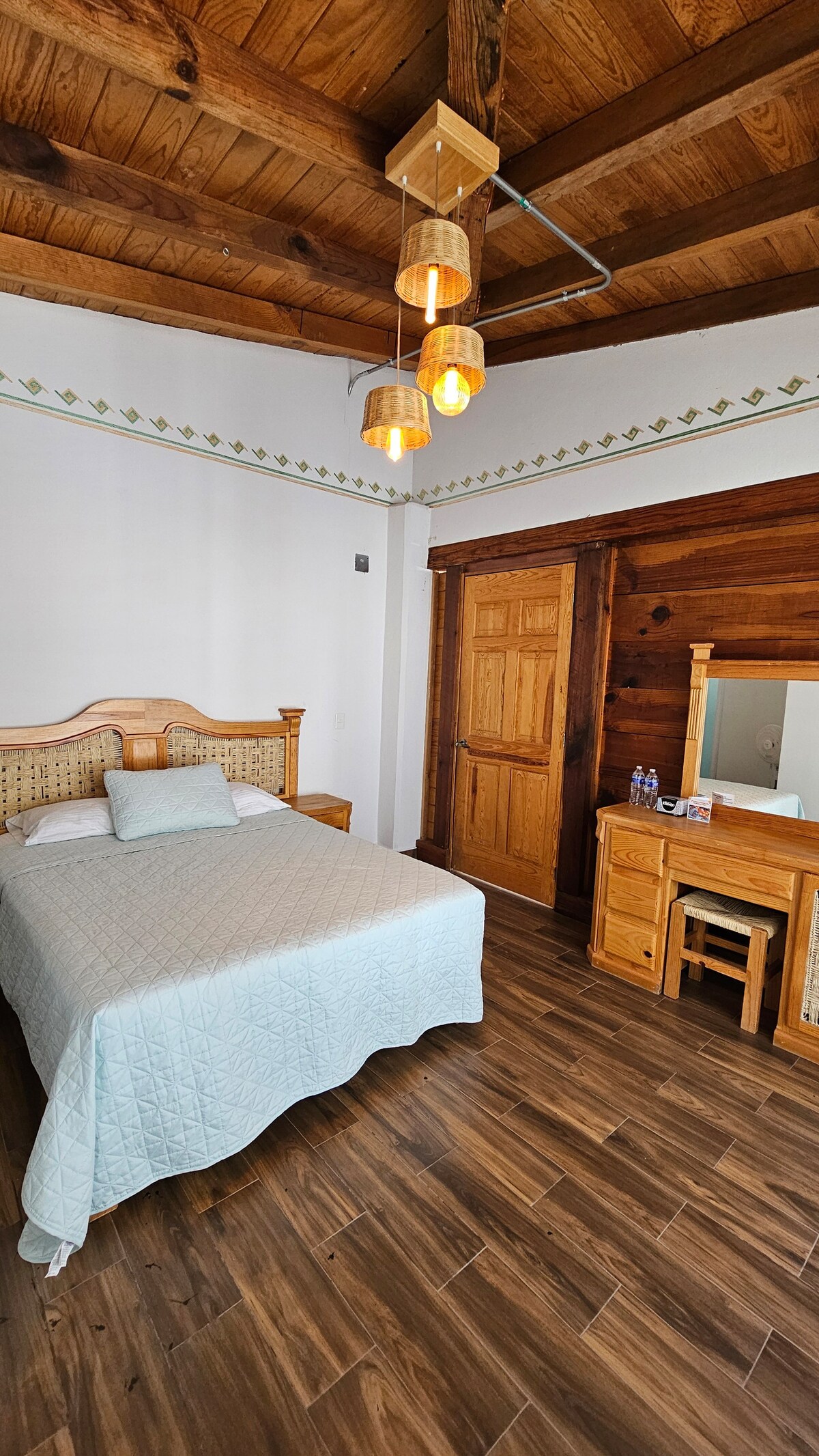 Esta encantadora habitación está construida en adobe, lo que le otorga un toque rústico y acogedor. El piso de barro, combinado con los detalles de mosaico de talavera en el baño, crea una atmósfera cálida y auténtica. Los roperos de madera apolillada añaden un aire vintage y lleno de carácter, mientras que las cenefas pintadas a mano adornan las paredes, reflejando la tradición y el arte local. Un espacio perfecto para quienes buscan una experiencia única y genuina.