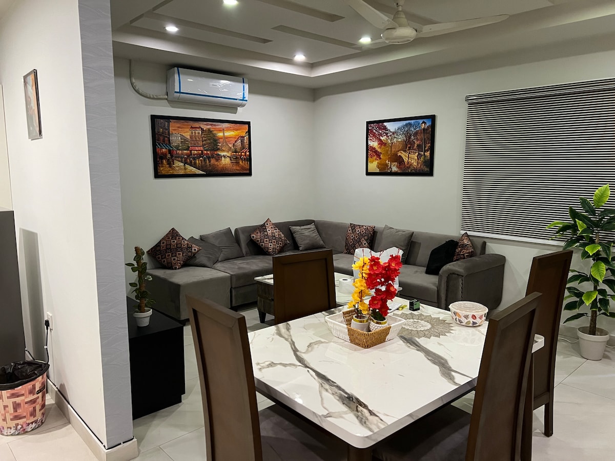 Welcome to Your Spacious 1BHK Designer Apartment! Enjoy breathtaking views of DHA 3 and Islamabad’s serene hills from this 1972 sq ft modern retreat on the 9th floor. Perfectly located opposite Giga Mall, this luxurious space features a king-size bed, 55" Smart TV, ultra high speed WiFi, a fully equipped kitchen and a private balcony. Ideal for couples, solo travelers or small families. Modern decor, smart locks and inverter ACs ensure a comfortable stay. Book now for a memorable experience!