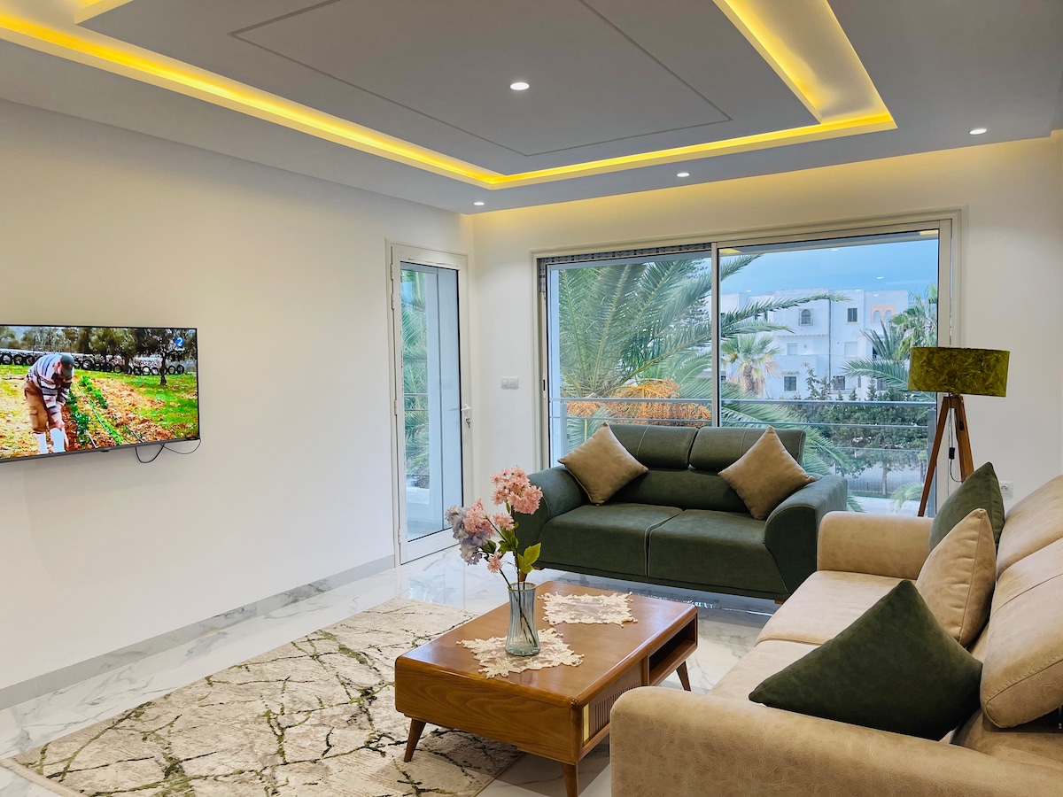 豪華公寓,位於居住區Kanta,設有獨立花園,位於蘇斯旅遊區中心,靠近海邊,您可以在酒店遊泳池、娛樂餐廳、水療按摩、理髮店、港口旁邊的商店,旁邊有高爾夫球場,那裡有所有熱鬧的餐廳,步行即可抵達 距離極佳的氛圍。 您可以免費使用游泳池和海灘,以及酒店的夜間表演