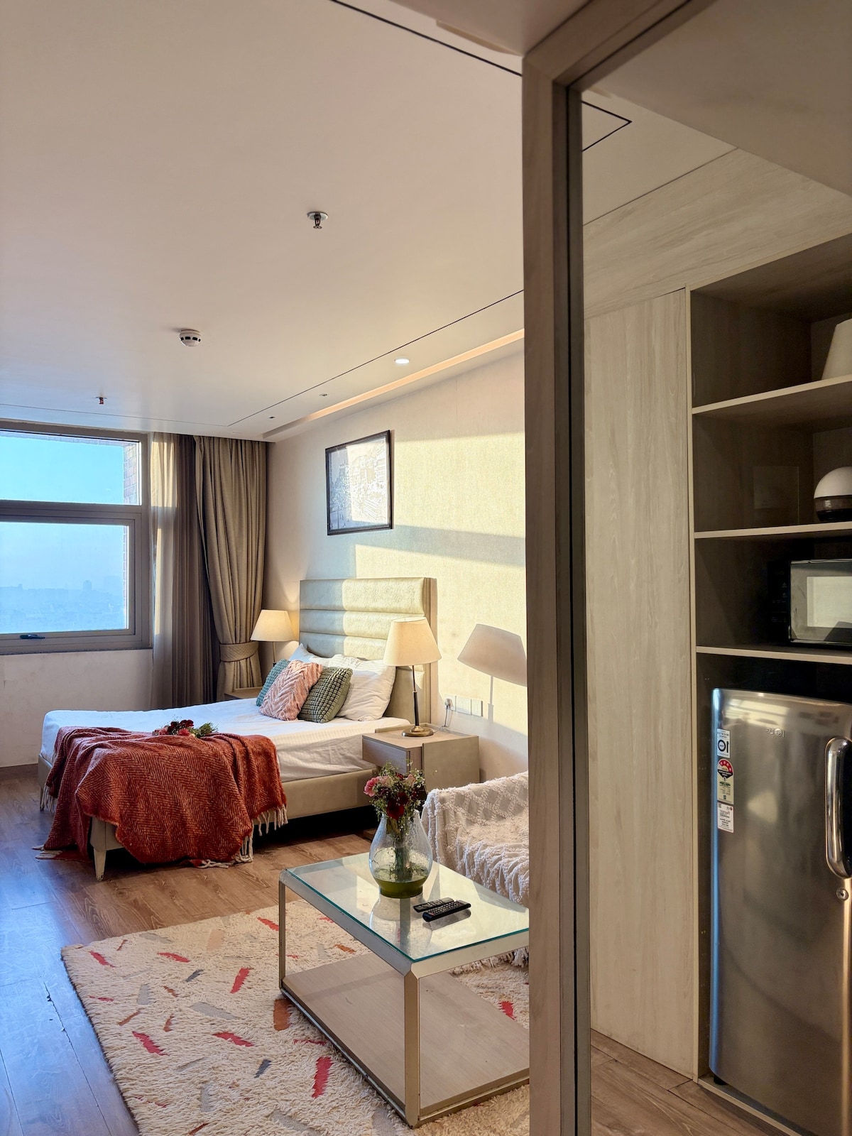 Welcome to Bridgerton, a bright studio at AIPL Joy Street in Gurgaon. You’ll have Room Controlled Central AC, fast Wi‑Fi and a large smart TV with all the OTT streaming apps. The kitchen comes with a fridge, microwave, fine cutlery, chic dishware, and premium linens for bed and bath. When you step outside you’ll have INOX theater, Sodhi’s Market, Blue Tokai, Poiz and Café Delhi Heights and many other premium cafés on ground floor of the building. Perfect for work trips or weekend getaways.