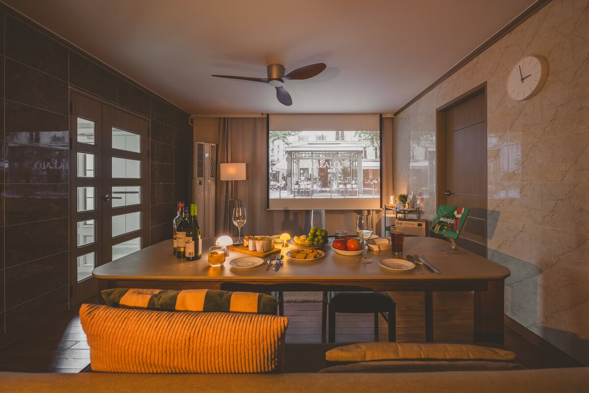 由於特別的Mystament ,■此房源已註冊並成為合法的國內住家分享公司。 ■ 這是一個可以方便使用的空間,就在釜山市中心西面和最近熱門的全浦旁邊。(從Jeonpo站1號出口步行3分鐘) 客廳有一個唱盤,可以欣賞音樂,一個Marshall喇叭,以及一個大客廳,配有系統架。 此外,還提供帶大螢幕的光束投影機,就像您在電影院一樣。(Netflix、Youtube Premium ) 睡房採用溫暖的米色調,營造舒適氛圍。 遊戲室配有任天堂Switch ,您可以與朋友和情人一起享受,室內裝潢漂亮,配有現代世紀的綠色物品。 提供一間大浴室,方便使用,廚房也很漂亮,配有漂亮的冰箱和最新的電器。 住宿周圍的區域非常安靜和私密,因為它位於西面和全浦之間。