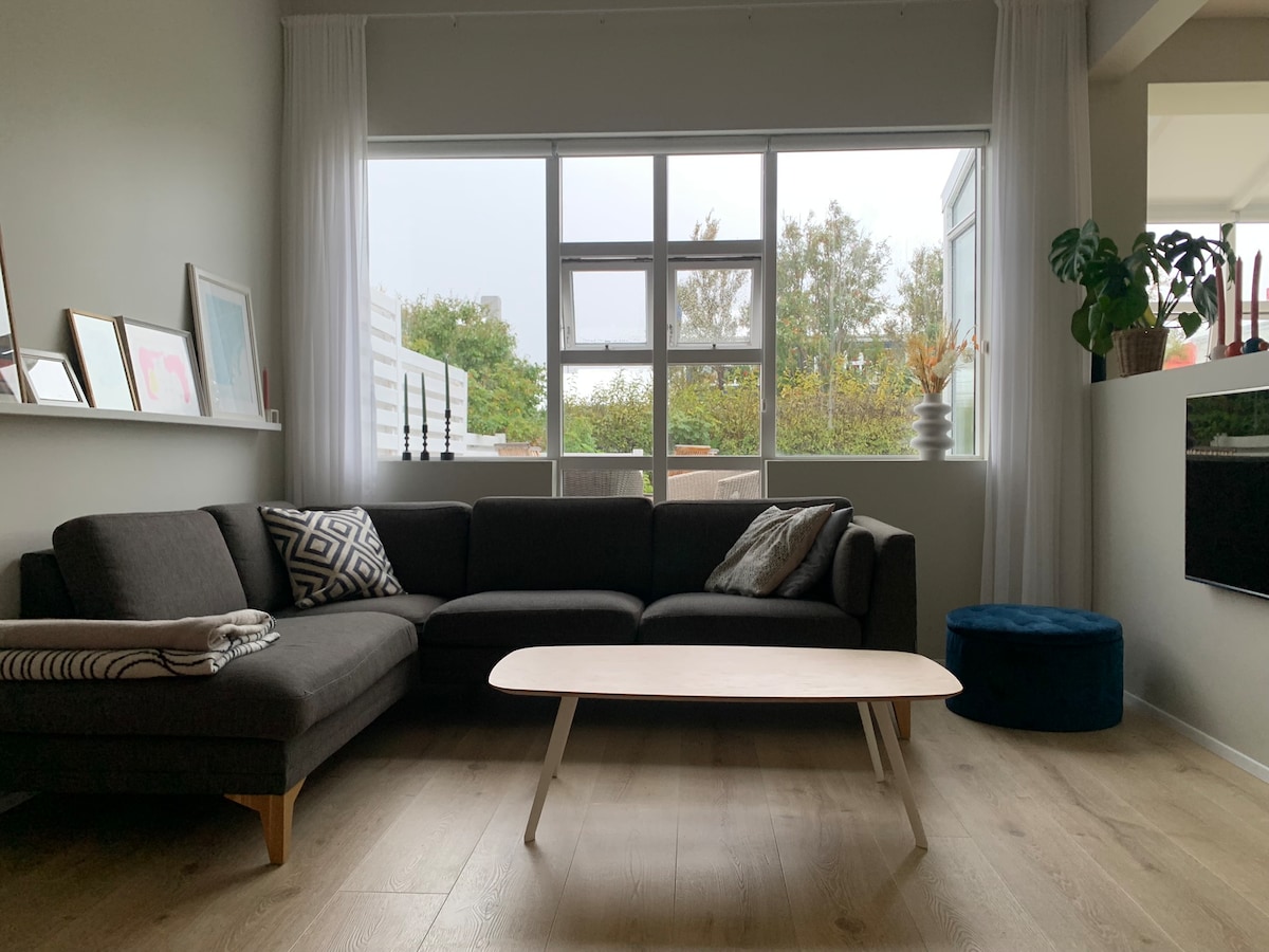 這是一間美麗寬敞的公寓,位於經過翻新的歷史悠久的房屋內,坐落在古樸的Thingholt中心街區的一條安靜街道上。 壁爐和花園,非常適合在市中心慵懶的日子放鬆身心。 雷克雅未克令人印象深刻的地標教堂Hallgrímskirkja的景觀。 步行15分鐘即可抵達BSI中央巴士站(機場巴士的市中心目的地)。