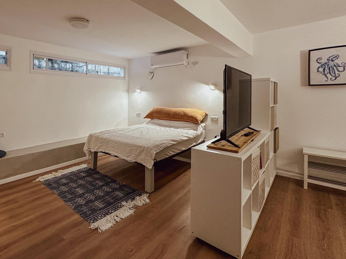從頭開始翻新的寬敞明亮的單間公寓,設有獨立入口和花園供您獨享,位於獨立樓層,在柑橘樹下遮蔭(樓梯下降到單位) 在單位內,您可以享用設備齊全的小廚房(冰箱、微波爐、電爐、水壺、咖啡機、餐具和烹飪用具)、寬敞的廚房島、配有360度旋轉智能電視的休息區、舒適的雙人床和私人浴室。 地理位置非常好,步行約5分鐘即可抵達迷人的咖啡廳、24小時超市和公共交通工具。 卡梅爾中心(Carmel Center)步行10-12分鐘即可抵達。 適合在市中心尋找安靜、綠色和舒適的人士。 街邊有免費停車位