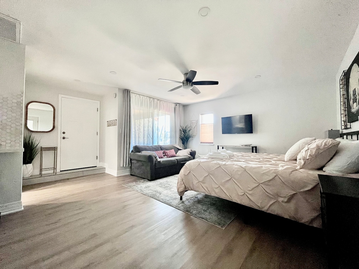 Enjoy our newly remodeled and professionally designed 1 bed, 1 bath private guesthouse. The stylish and cozy suite includes a full kitchen with brand new appliances, a work space, living room, and bedroom with a closet and ensuite bathroom. It is located just 15 mins away from major destinations, such as ASU, Sky Harbor International Airport, and fun attractions. We offer free parking on the property, in addition to wi-fi, Roku TV and toiletries. We would love to host you!